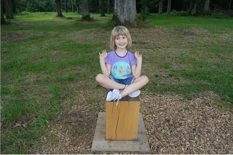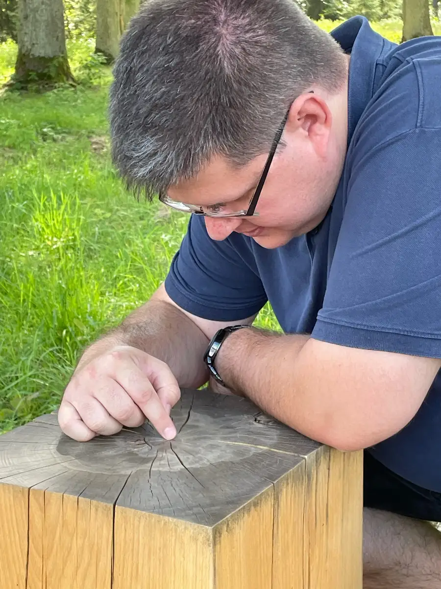 Amina zählt die Jahresringe unseres Massivhockers