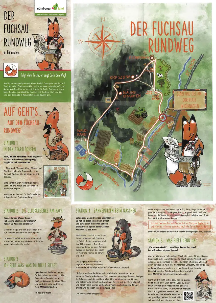 Auf dem liebevoll gestalteten Fuchsau-Rundweg bei Kühnhofen können Kinder die Natur auf etwa 3,7 km Länge spielerisch entdecken. Sei es beim Durchwaten eines seichten Bachbetts oder beim Erraten von Vogelstimmen, die über einen QR-Code mit dem Smartphone abgespielt werden können. An jeder der 14 Stationen erwartet euch einer der von Ute Scharrer wundervoll gezeichneten Füchse und stellt euch etwas Neues und Interessantes vor. Starten könnt ihr am besten bei der Gaststätte Fuchsau. Dort gibt es jede Menge Parkplätze. Euer Wanderzeichen ist ein runder Sticker mit dem kleinen Fuchs. Uns hat dieser ruhige und entspannte Weg heute richtig gut gefallen.