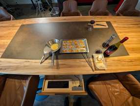 Der erste höhenverstellbare Konferenztisch aus Massivholz, der auch kochen kann