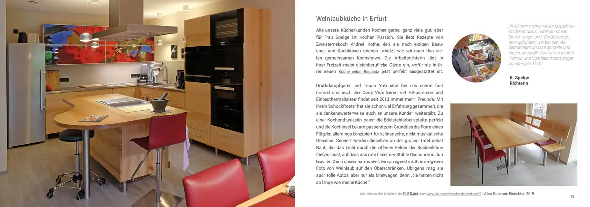 das Jahrbuch 2019 der Möbelmacher habe ich gerade zur Seite gelegt. Es ist ein haptisches und visuelles Vergnügen das kleine Format in der Hand zu halten. Die Gestaltung mit den Bildern (professionell, stilvoll) und den Texten (kurz, informativ, humorvoll) bildet eine Einheit. Es ist Dir gelungen, auf kleinem Raum das Wohnen auf ein kulturelles Niveau zu heben, das mit Industrieprodukten eben nicht zu erreichen ist. Es sind nicht nur die kulturellen Überschneidungen mit der Literatur, den Büchern, der Musik oder dem Kochen, die ja ohne Zweifel unserem Kulturkreis angehören, auch die Information über Auswahl, Verarbeitung und Behandlung der Hölzer ist Kultur und es lässt beim Leser die Mitverantwortung für Nachhaltigkeit entstehen, für mich ein zentraler kultureller Auftrag.