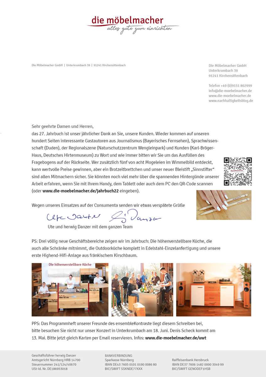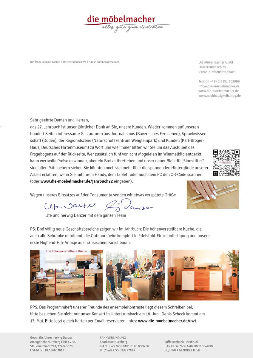 Vielen Dank, Euer Jahrbuch ist wieder toll geworden - die möbelmacher trotz 27 Jahren, jung, innovativ, kreativ und… total modern, da regional und umweltbewusst - vielen Dank