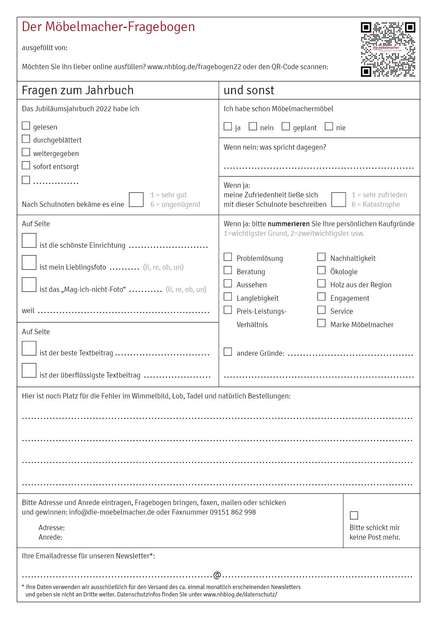 wir haben uns - wie jedes Jahr - wieder sehr über Ihr Jahrbuch gefreut. Immer wieder tolle Ideen, die Musikanlage hat mich dieses Jahr besonders beeindruckt. Im Anhang senden wir die digitale Version unseres Fragebogens. Wir hoffen Sie und das Team sind gut ins neue Jahr gestartet und wünschen für 2023 alle Gute. Viele Grüße,