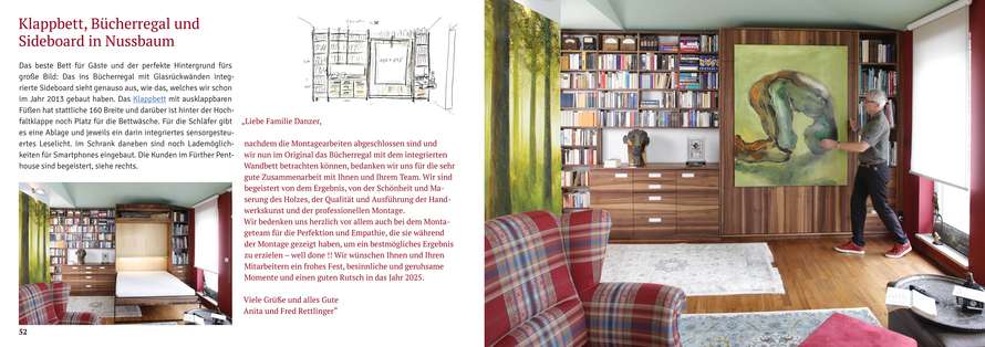 das Jahrbuch liegt neben mir. Ich habe es gelesen, neugierig und mit Interesse. Hier wird deutlich, dass Dein Betriebskonzept nicht nur nachhaltig ist, sondern vorbildhaft einiges Gewicht hat, gerade auch ideell. Die schönste Einrichtung ist auf Seite 53 zu sehen (Bücherwand mit Klappbett in Nussbaum). Deine Texte sind alle leicht verständlich geschrieben, nicht zu lang und auf das Wichtigste konzentriert. Mein Lieblingsfoto findest Du auf der Rückseite des Jahrbuches, Seite 100, die Sicht auf das Werkgebäude der Möbelmacher und das schöne Sittenbachtal.
