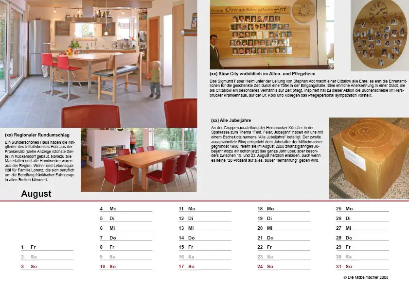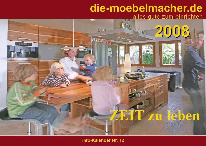 52 Seiten, über hundert Bilder und viele Infos über unsere Arbeit, für die wir 2007 den Thalhoferpreis erhalten haben. Alles Gute zum Einrichten nicht nur fürs private Haus, sondern auch für den Objektbereich (Ladenbau, Büro, Messe) und natürlich für wunderschöne Bäder. Für ehrenhafte private und Pressezwecke kann der Kalender08 als pdf-Datei (7MB) heruntergeladen werden. Am Möbelkauf interessierten Menschen oder Pressemenschen schicken wir ihn gerne zu, anderen auch, aber da berechnen wir 7 Euro.