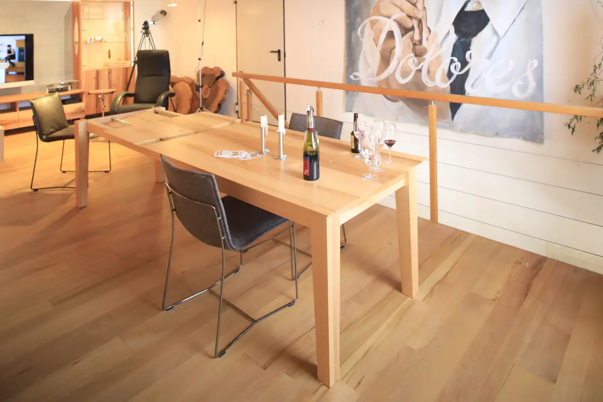 Und das zeigen wir Ihnen alles: In und Outdoorküche, High-End Hifi-Anlage in unserem Kirschbaum, Tische, Stühle, Sideboard und höhenverstellbarer Massivholzschreibtisch