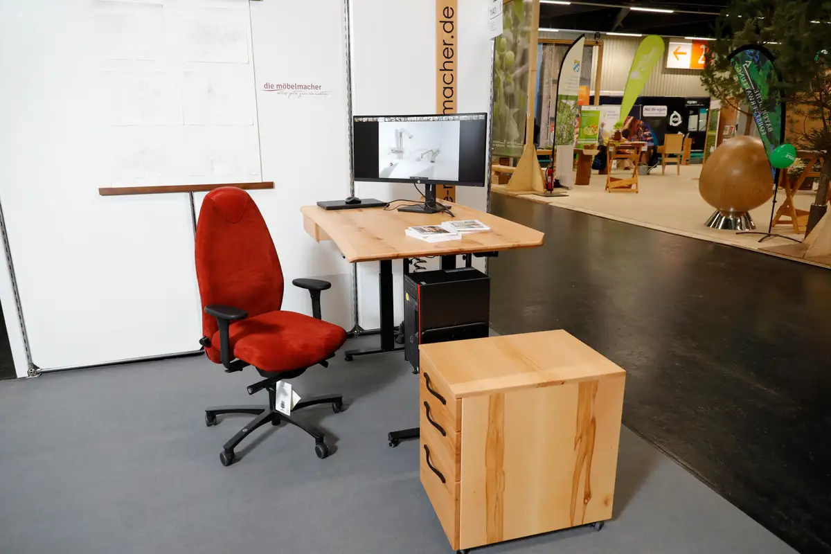Der höhenverstellbare Schreibtisch aus Massivholz und der Bioswing von Haider