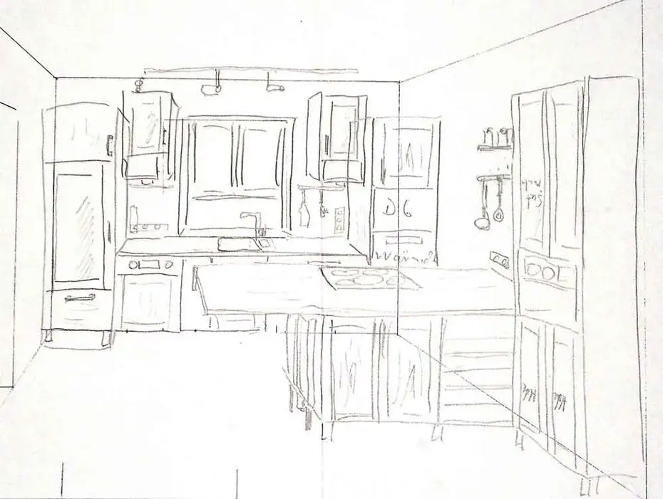 Die erste Freihandzeichnung der Consumenta Massivholzküche mit der neuen Miele Titan Serie