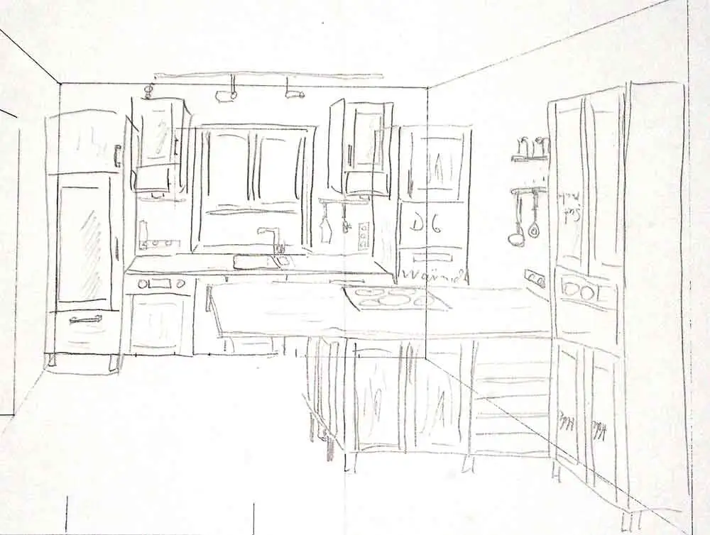 Auch in kleinen Küchen hat alles Platz, überzeugen Sie sich selbst auf der Consumenta. Die Zeichnung entstand im November 2004 während eines Kundengesprächs, die Fettflecken stammen vom Tepan Yaki.