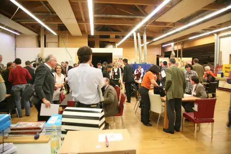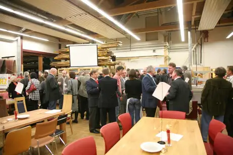 Die Einladungen in der neben dem bekannten Moderator und dem Menü auch ein Grußwortverbot und die Sitzordnung der Partner an unterschiedlichen Tischen angekündigt war, wurde selektiv an Politiker, Kunden des Initiativkreises und Forstfachleute verschickt. Gegen 18:30 füllte sich die leergeräumte Werkstatt der Möbelmacher, in der statt Holzstapeln und Maschinen 10 Tische und eine edle Massivholzküche aufgebaut waren. Eine Tischnummernfolge auf den Namensschildern zeigte an, an welchen Tisch man welchen Gang zu sich nehmen wird, denn nach jeder Diskussion und jedem Gang wurden die Plätze gewechselt.