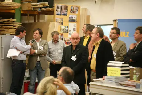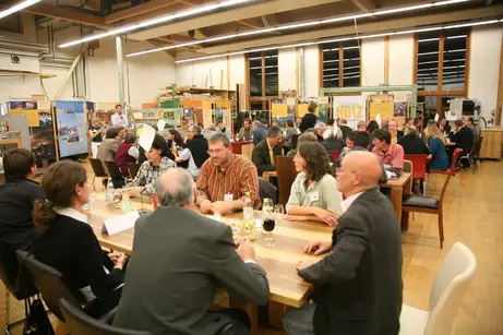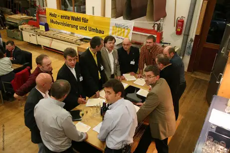 herwig Danzer von den Möbelmachern hatte beim „Multistakeholdermeeting“ des Rates für Nachhaltige Entwicklung die „Weltcafemethode“ kennen gelernt, bei der anmoderierte Fragen an Tischen mit 6 bis 10 Personen diskutiert und die Gesprächsergebnisse von Protokollanten festgehalten werden. Daraus entwickelte er das „Weltrestaurant“, das eben nicht nur für wissensbegierige Seminarteilnehmer, sondern auch für Kunden, Politiker und Fachleute gedacht ist, die sich neben der unauffälligen Wissensvermittlung auch auf einen interessanten Abend freuen sollten. Der Freitagabend vor den beiden Holz-Infotagen sollte aber nicht nur für die Besucher interessant werden, sondern auch dem Initiativkreis neue Ideen und Anregungen bringen. Die Kombination von Workshop mit einem themenbezogenen Viergang-Menü und den anschließenden Info-Tagen stellte Danzer im Förderantrag dem Holzabsatzfonds vor, der die Veranstaltung sofort aus dem Programm „Marketing Forst und Holz“ einem Betrag nahe der Höchstfördersumme unterstützte.