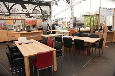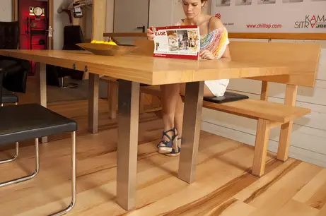 Tische und Bänke aus dem Massivholz der Region in Einzelanfertigung bieten ganz andere Einrichtungsmöglichkeiten, als die Möbellager am Stadtrand. Außerdem zeigen wir als Premiere das neueste Modell aus der Diners-Collection von Jori.
