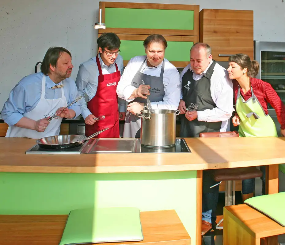 Im Jahr 2000 entstanden unsere Kochshcows in Zusammenarbeit mit dem Bayerischen Rundfunk, weil wir zeigen wollten, dass Massivholzküchen nicht nur schön sind und sich angenehm anfühlen, sondern auch ebenso funktionale wie langlebige Werkzeuge zum Kochen. Die praktische Vorführung mit Profiköchen liefert dafür den Beweis.