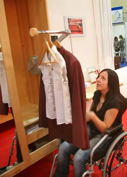 Die herunterklappbare Kleiderstange (Kleiderlift) ist auch im Stizen gut zu erreichen