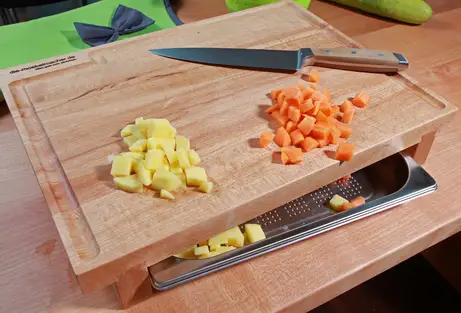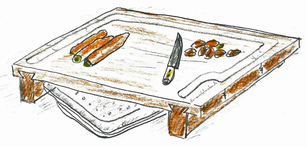 Das Schneidbrett wird mit den Gratleisten nicht nur ergonomisch angenehm erhöht, sondern es hat auch ein Teller oder Garbehälter darunter Platz, in das man das Schneidgut ganz komfortabel schieben kann.