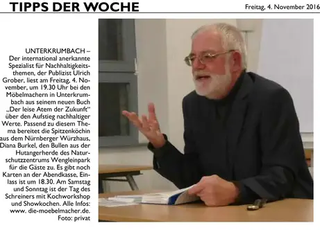 Ulrich Grober - anerkannter Nachhaltigkeitspapst in Deutschland - liest über den Aufstieg nachhaltiger Werte. Kulinarisch wird er dabei eingerahmt von der Nürnberger Spitzen- und Slow Food-Köchin Diana Burkel (www.wuerzhaus.info).
