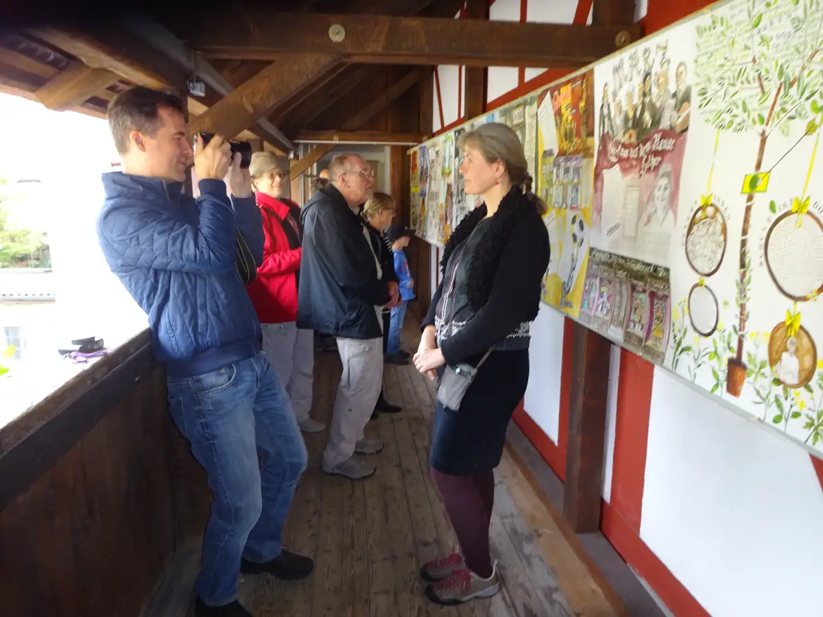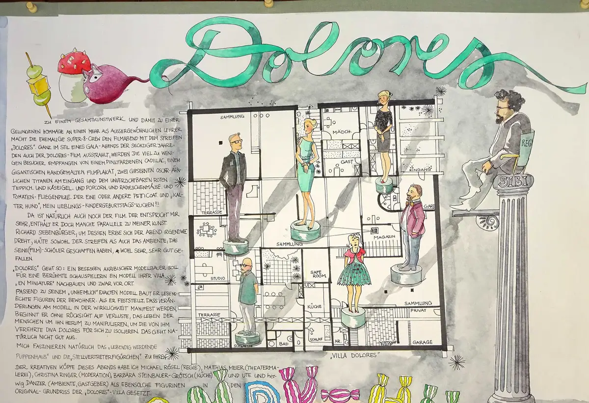 Außerdem zeigen wir das 8x1 Meter-Aquarell von Ute Plank, das ihre Arbeit als Lokaljournalistin künstlerisch dokumentiert. Darunter ist auch ein Element, das unsere Filmgala mit dem Film Dolores künstlerisch interpretiert.
