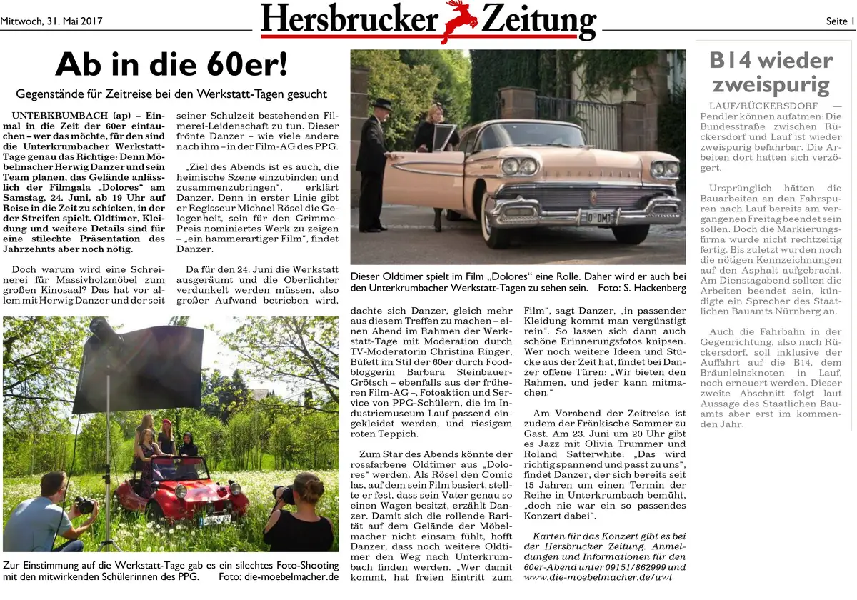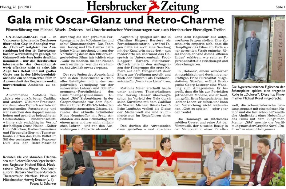 Am Samstag der Werkstatt-Tage (24. Juni 2017, 18 Uhr ) zeigen wir den Kinofilm "Dolores" von Michael Rösel, der wie die Fernsehmoderatorin Christina Ringer, der Theatermaler Matthias Meier oder Möbelmacher herwig Danzer am Hersbrucker Gymnasium bei dem kürzlich verstorbenen Deutschlehrer Richard Siebenbürger viel fürs Leben gelernt hat.