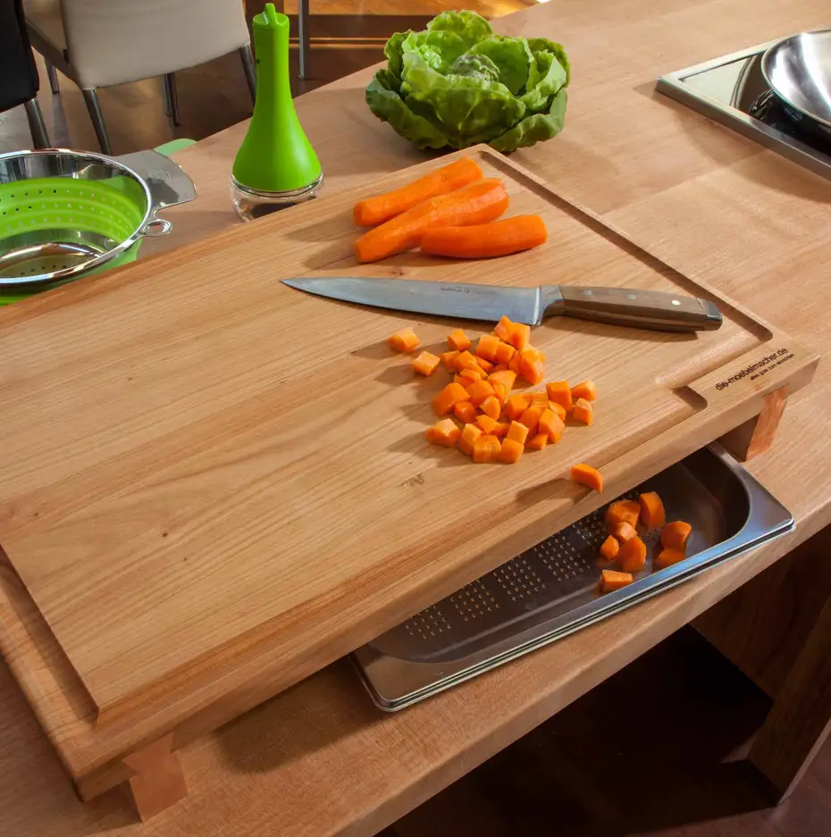 Um beim Live-Schreinern auch richtig handwerkliche Verbindungen zeigen zu können, werden unsere Schneidbretter mit Gratleisten "aufgemotzt". Dadurch kann man Teller oder Garbehälter der Dampfgarer darunter platzieren und das Schneidgut einfach reinschieben. Das Foto ist noch eine gemogelte Montage, aber sichern Sie sich trotzdem schon den "Frühbucherpreis", denn das Brett ist kalkulatorisch das dreifache wert. Einfach eine schnelle Mail an info@die-moebelmacher.de .