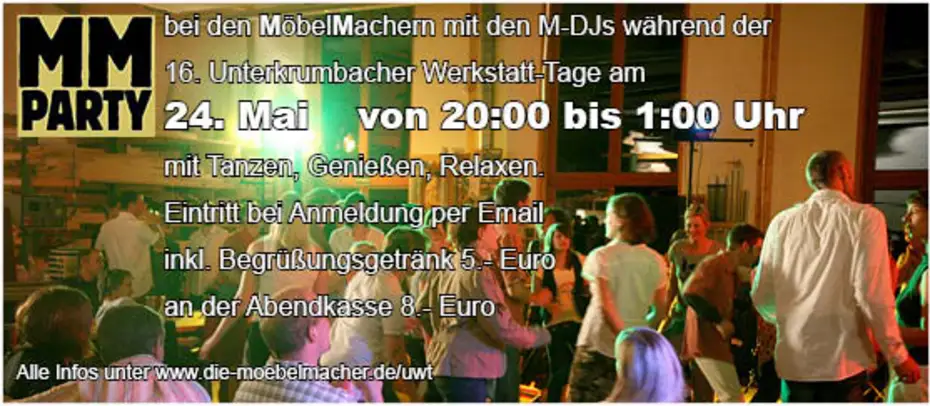 Bei der MM-Party (MM für MöbelMacher, normalerweise ist es ja die M-Party am Michelsberg) gibt es gute Musik von Standard bis Disco und die Auswahl richtet sich vor allem nach den Wünschen des Publikums.