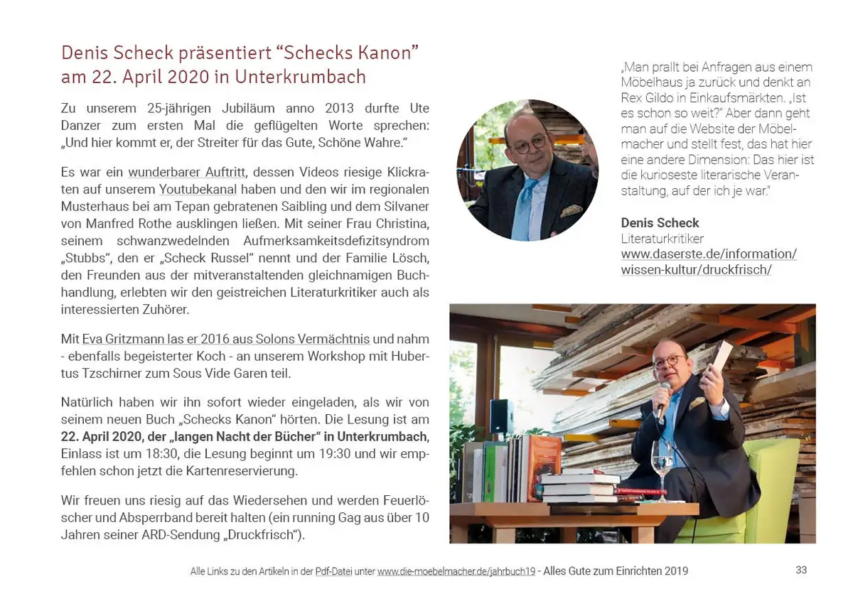 Schon zum dritten Mal wird Denis Scheck bei uns zu Gast sein, diesmal liest er aus seinem neuen Buch "Kanon" in dem er die aus seiner Sicht 100 wichtigsten Werke der Literatur vorstellt und das man in der Buchhandlung kaufen kann, oder sich die einzelnen Kapitel beim SWR vorlesen lassen kann.. Bitte jetzt schon Karten per Email reservieren, es wird sicher wieder eine fulminante Veranstaltung, wie immer gemeinsam mit der Buchhandlung Lösch organisiert. (In dieser Googleplaylist können sie die ganze Veranstaltung vom Jubiläum 2013 nacherleben)