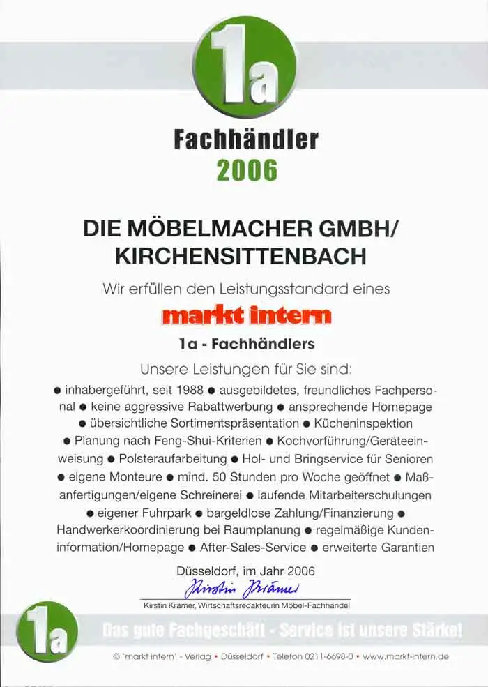 Die Fachleute von Markt Intern haben uns nach Prüfung aller Kriterien zum 1a Küchen-Fachhändler gekürt. Damit sind wir der einzige Hersteller und Verkäufer von Massivholzküchen, der diese Auszeichnung bisher bekommen hat.