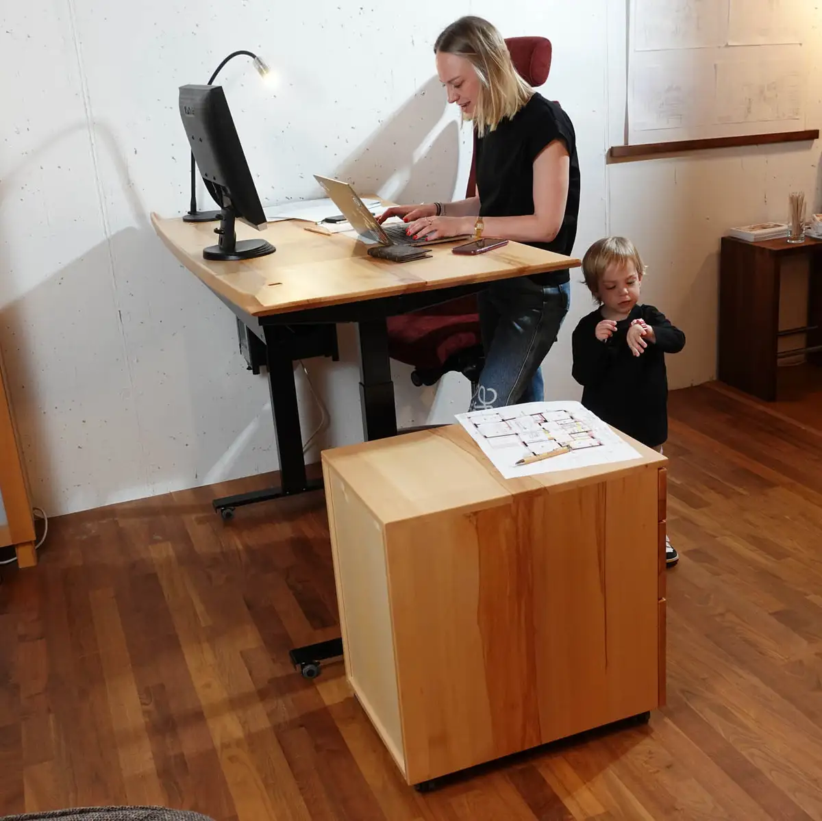 Aber auch das Arbeiten außer Haus bleibt nicht ausgespart – schon früh bereicherten die Möbelmacher den Markt mit Stehpulten zum gesunden Arbeiten als der Begriff Sitz-Stehdynamik noch weitgehend unbekannt war. Bald kamen professionelle Lösungen für Arbeitsplätze und Arbeitsräume hinzu. Nicht wegzudenken ist der höhenverstellbare Schreibtisch. Alles aus dem natürlichen Material Holz, das keine chemischen Stoffe emittiert. Zusammengefasst: wo sich der Mensch wohlfühlt, da arbeitet er auch gerne und das besonders gut.