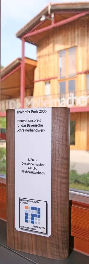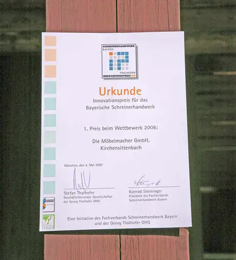 Am 4. Mai empfingen wir am Schreinertag 2007 in der Fürther Stadthalle den mit 4000 Euro dotierten Thalhoferpreis aus der Hand des Stifters garselbst. Scheck, Skulptur aus Nussbaum und Urkunde nahmen wir dankbar entgegen und freuten uns über eine Auszeichnung, die die Innovationskraft im bayerischen Schreinerhandwerk belohnt.