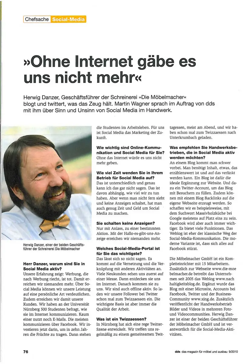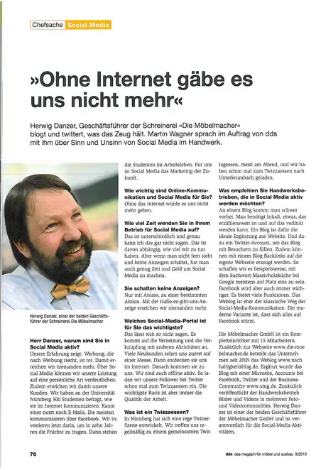 Fachzeitschrift DDS (Der Deutsche Schreiner) über die Social Media Aktivitäten der Möbelmacher