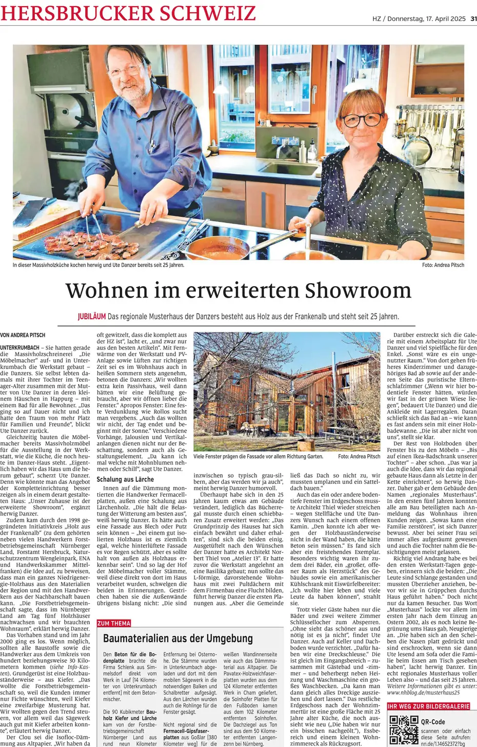 In Unterkrumbach bei Hersbruck steht ein regionales Musterhaus des Initiativkreises Holz aus der Frankenalb, dort hat sich Familie Kölbl vor dem Bau ihres eigenen Holzhauses umgeschaut und sich viele Anregungen geholt z. B. dass die Fassade auch ohne chemischen Holzschutz gut aussieht und lange hält. Weder außen noch innen müssen Holzhäuser aussehen wie Almhütten. Kölbls hat die moderne und gar nicht rustikale Innengestaltung des regionalen Musterhauses gefallen, hier konnten sie sich ein Urteil über Handwerke und Baustoffe aus der Region bilden. Neben dem Holz gehören dazu auch Solnhofener Natursteinfliesen aus dem nahen Landkreis Eichstätt, aber Regionalität allein reicht als Verkaufsargument für diese Naturbaustoffe nicht aus.