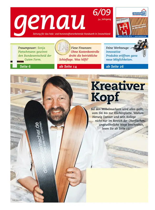 "Genau" - ist auch der Artikel des sympathischen Redakteurs, Lutz Odewald, der uns für das Fachblatt für Schreiner und Tischler in Deutschland besuchte und herwig Danzer samt unserer schönen <link produkte/holzski.html>ApfelSki</link> auf Cover packte.