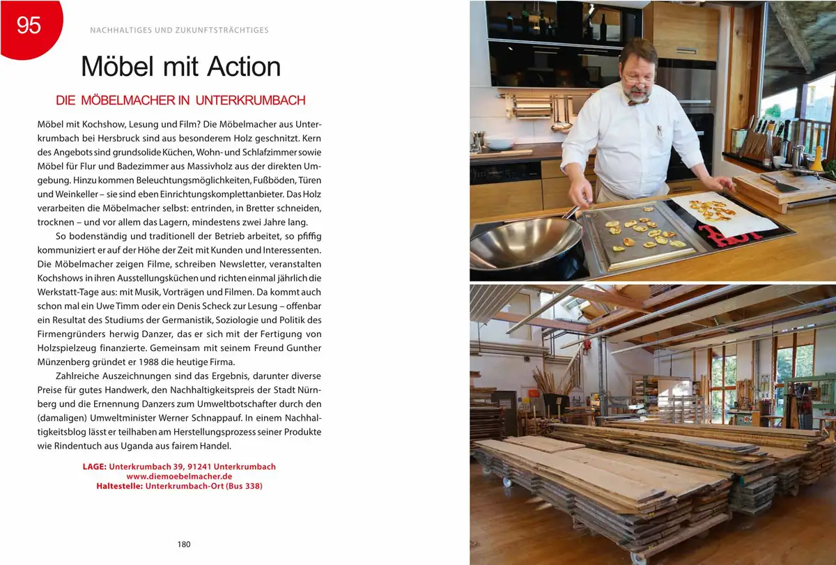 "Gibt es „nachhaltige“ Unternehmen, die – außer ihrem eigenen Anspruch - keine offizielle Norm erfüllen, keine „echte“ Zertifizierung besitzen und keinem zertifizierenden Verband angehören? Für „Die Möbelmacher“ könnte das zutreffen, denn der Fokus der Massivholzschreinerei liegt auf nachhaltigem Wirtschaften in der Region: Kurze Wege, heimische Hölzer und Langlebigkeit sind hier Gebote der ersten Stunde."