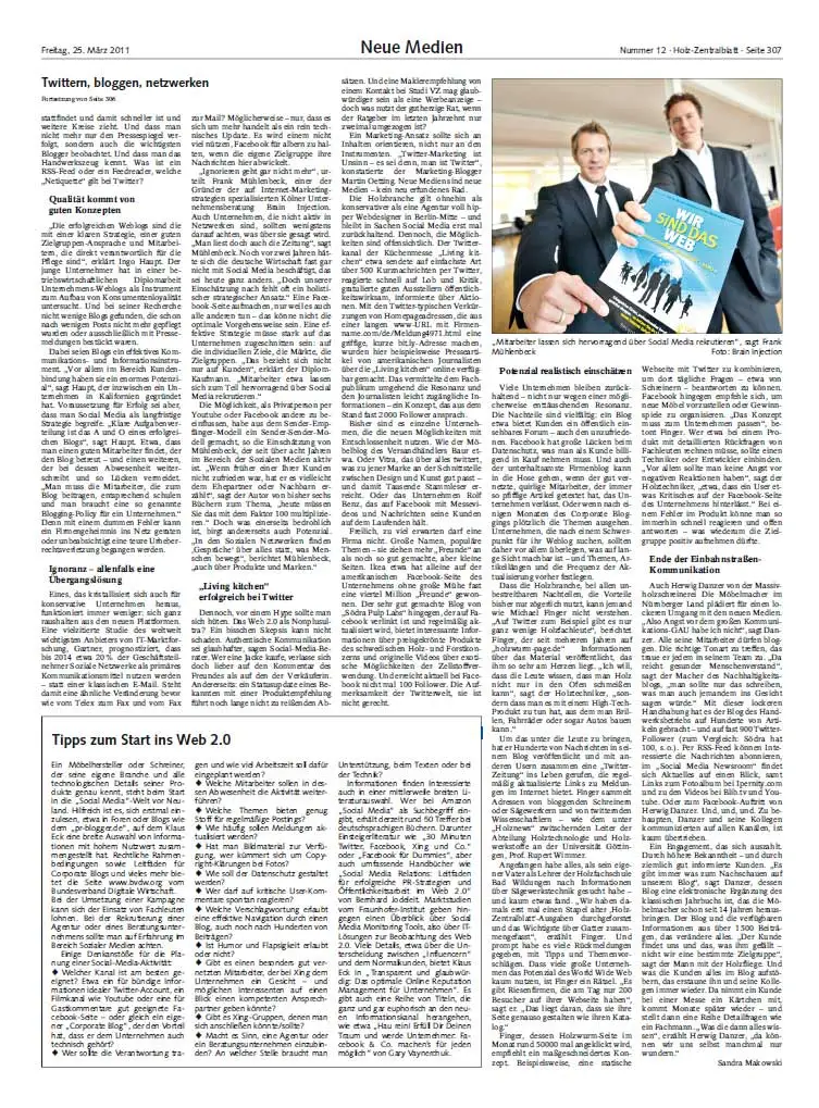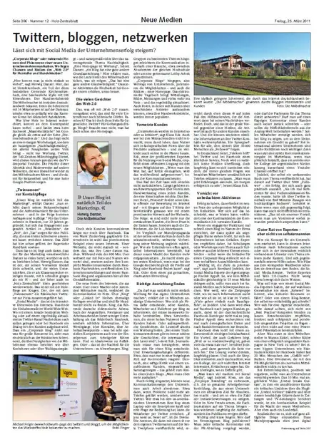 Holz-Zentralblatt vom 25. März 2011 über das Social Media Potenzial im Handwerk