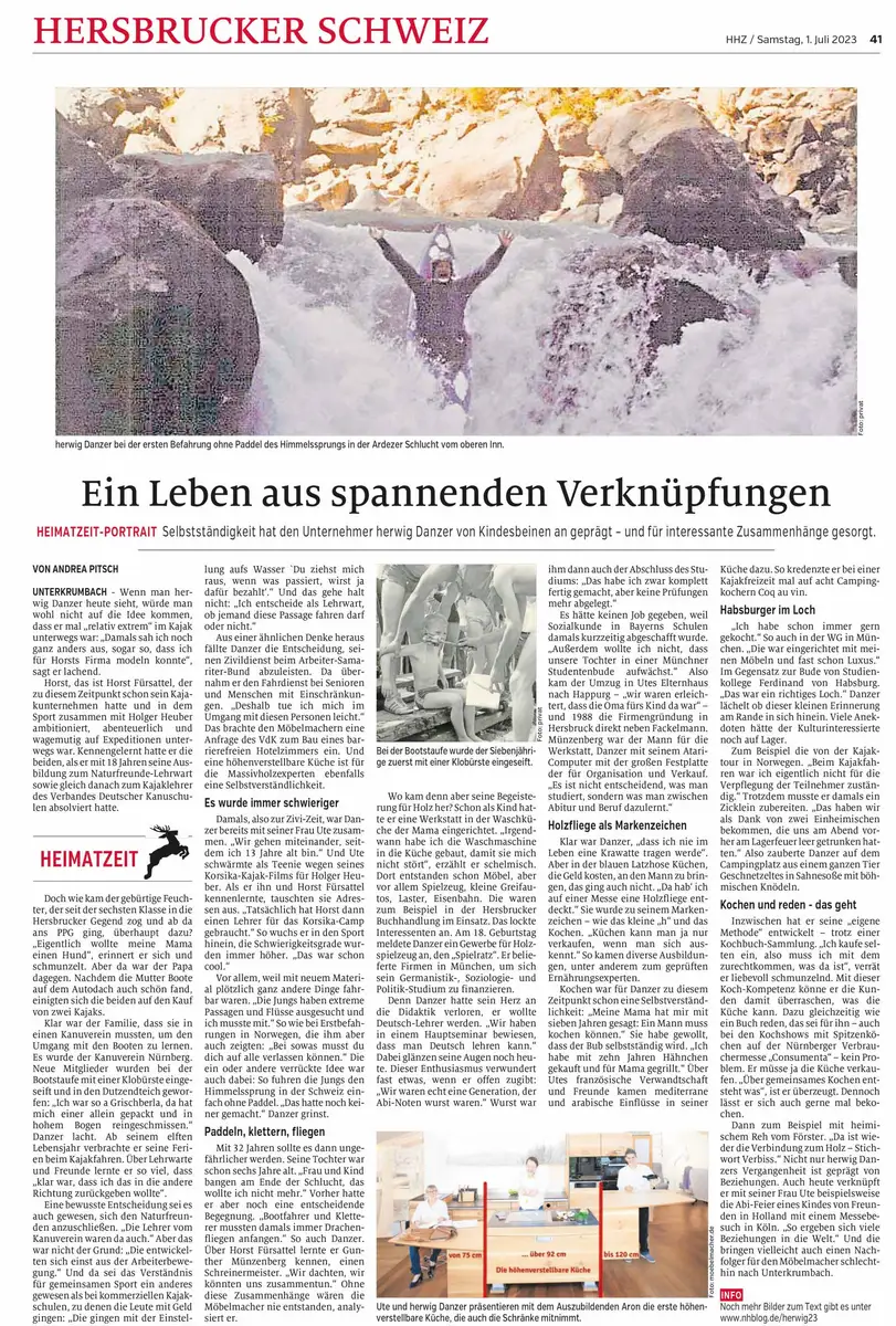 Andrea Pitsch will ihre Heimatzeit-Portraits aus einem ungewohnten Blickwinkel schreiben und wählte für herwig Danzer Perspektive des extremen Kajakfahrens . Hier ist er auf der Homepage nachzulesen und hier in Nachhaltigkeitsblog mit vielen zusätzlichen Bildern.