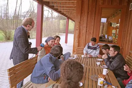 Atmo wechseln: I (draußen) | Während der Geschäftsführer Herwig Danzer das Zwetschgen-Sideboard und dessen Preis erläutert, sitzt der Rest der 17-köpfigen Belegschaft gerade gemeinsam am Massivholz-Pausentisch im Freien. Zur Nachhaltigkeit bei den Möbelmachern gehören auch familienfreundliche Arbeitszeiten, eine 36-Stunden-Woche und großzügige Pausen für die Mitarbeiter. Wer gute Produkte kaufen möchte und für sich selbst gute Arbeitsbedingungen wünscht, der müsse auch anderen ihre Arbeit gut bezahlen, meint der Schreinergeselle Mathias Deinhard. Er weiß dabei, dass man von einem Gesellengehalt, wie er es selbst bezieht, beispielsweise auf ein Bett der Möbelmacher lange sparen müsste: