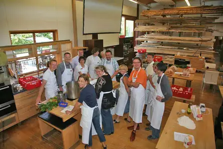 Zwei Massivholzküchen hatten die Küchenbauer in die Werkstatt gestellt, wo ab 13 Uhr 15 Kunden zusammen mit Jürgen Beyer vom Rückersdorfer Roten Ochsen Simmelsdorfer Saiblinge filetierten, Henfenfelder Hähne marinierten und den Nudelteig für die Maultaschen kneteten. Das Ergebnis war ein sterneverdächtiges 7-Gänge-Menü, das 9 frischgebackene Bedienungen freundlich und fachmännisch 80 Gästen servierten. Sie hatten nämlich drei Stunden vorher am „Bedienungs- Crashkurs" von Jutta Woker teilgenommen, die das Kellner-Basiswissen kompetent und witzig vermittelte.
