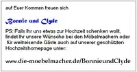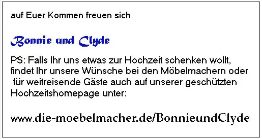 2. Auf Ihrer Einladung vermerken Sie, dass Sie den Geschenke- bzw. Hochzeitstisch in Unterkrumbach haben und verweisen auf die Internetseite www.die-moebelmacher.de/IhrName, die öffentlich nicht zugänglich ist.