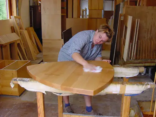 Der tief eindringende Leinölanteil härtet das Holz beim Trocknen von innen. Nach dem langwierigen Trocknungsvorgang und dem Zwischenschleifen werden ein zweiter, und - je nach Verwendungs-zweck - auch noch mehrere Ölaufträge einpoliert.