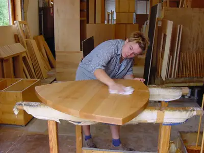 Die Kanten werden nach Kundenwunsch mit der Oberfräse gerundet und zum Schluss zunächst maschinell und dann per Hand geschliffen.