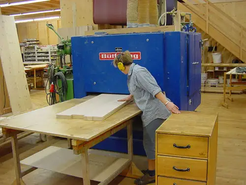 Die Breitbandschleifmaschine ermöglicht rationelles und rückenfreundliches Schleifen der verleimten Platten.