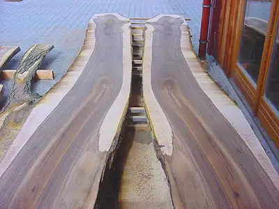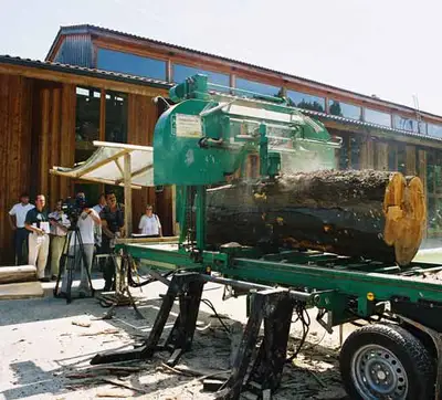 Mit einem mobilen Sägewerk können wir am eigenen Gelände auch die wertvollen dicken Stämme je nach Maserung, Farbspiel und Ästen individuell aufschneiden.