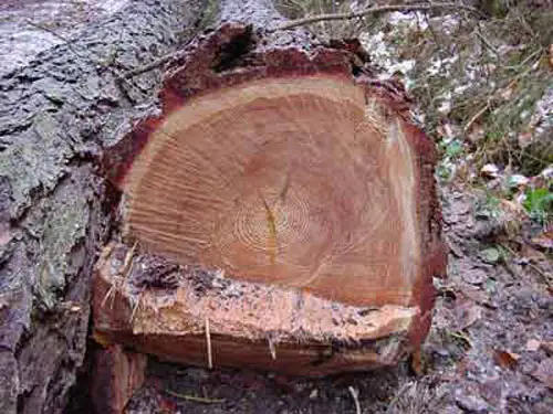Weil sich die Bretter vom Kern wegdrehen werden, dreht man sie um. (Die obere Hälfte des Baumes ist gewendet). So kann in den "Schüsseln" das Regenwasser nicht stehen bleiben, sondern von der runden Seite ablaufen.