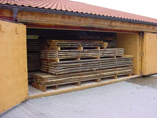 Kurz vor der Verarbeitung kommen die Stapel in die Trockenkammer. Dort wird das bestellte Material auf die niedrige Luftfeuchtigkeit in beheizten Räumen vorbereitet um die Probleme des "Verziehens" weitgehend auszuschließen. Trotzdem wird Massivholz, wie auch der Schreiner selbst, immer "arbeiten."