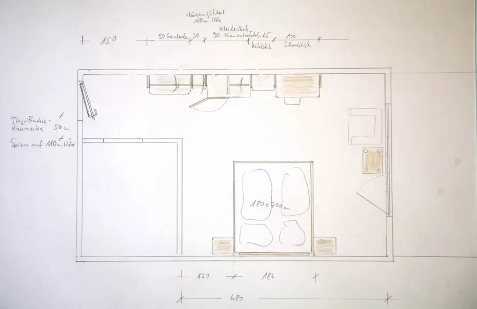 Nach allem, was wir an DIN-Normen durchgearbeitet haben, müsste dieses Hotelzimmer für Rollstuhlfahrer eigentlich funktionieren. Wir freuen uns aber wirklich, über jeden Verbesserungsvorschlag, wir haben unsere Massivholzmöbel mit L-Winkeln so an der Wand befestigt, dass alle großzügig unterfahrbar sind (35 cm), außer dem Bett, bei dem nach unserer Überzeugung 25 cm genügen müssten, vor allem, wenn zur Terassentür über 150 cm Platz sind. Denn wir befürchten, dass das Zimmer zu viel an Flair verliert, oder zu viel an Pflege erinnert, wenn wir das Bett noch höher machen. Das mag in Einzelfällen sinnvoll sein, für ein Musterzimmer legen wir aber Wert darauf, dass es auch eine angenehme Atmosphäre bietet.