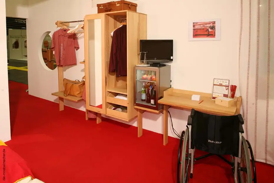Barrierefreie Schränke aus massiver Buche, denen man die Rollstuhltauglichkeit nicht ansieht, machen das Hotelzimmer auch für gesunde Menschen attraktiv.