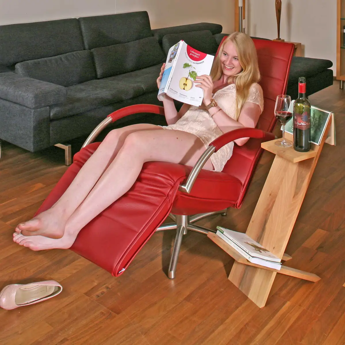 Natürlich passt unser Weinbuchhalter zu allen Relaxmodellen von Jori (und sogar zu Relaxsesseln von anderen Herstellern, auch wenn das eigentlich nicht geplant war), hier präsentiert Larissa den Mensana