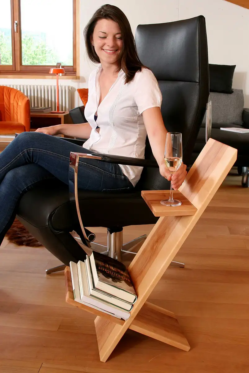 Zum entspannten Lesen am Abend gehört aber auch eine feine Limonade, Mineralwasser, ein gutes Glas Wein, Sekt oder auch ein Bierchen. Das will man ja nicht am Couchtisch abstellen, der weit weg steht, sondern direkt in Griffweite haben.