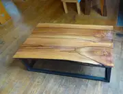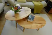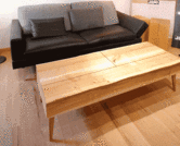 Den Couchtisch gibt es in vielen Holzarten, wobei wir ob der Lebensdauer nur Harthölzer, wie zum Beispiel Buche, Eiche, Ahorn, Kirschbaum, Esche, oder Elsbeere empfehlen. Am besten einfach nachfragen, was gerade auf Lager ist, dann schicken wir Fotos der verfügbaren Platten.