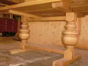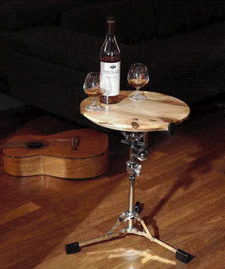 Unser Couchtisch hat ein Snare-Gestell als Basis (das stellen die Schlagzeuger normalerweise ihre „kleine Trommel=Snare" drauf) und eine wunderbar elegant gefräste Tischplatte aus fränksichem Hartholz.