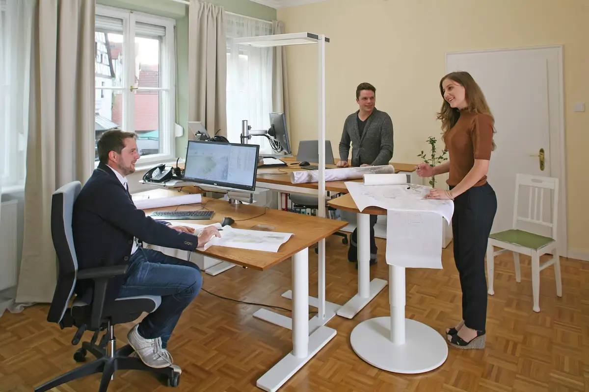 Höhenverstellbare Massivholz-Schreibtische in Eiche im Büro der Gebrüder Simon in Lauf