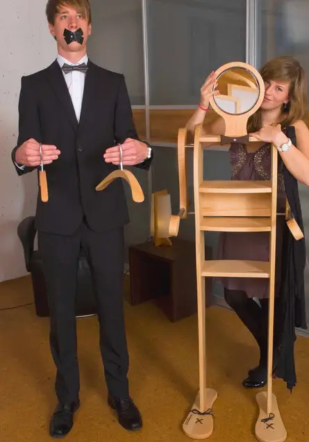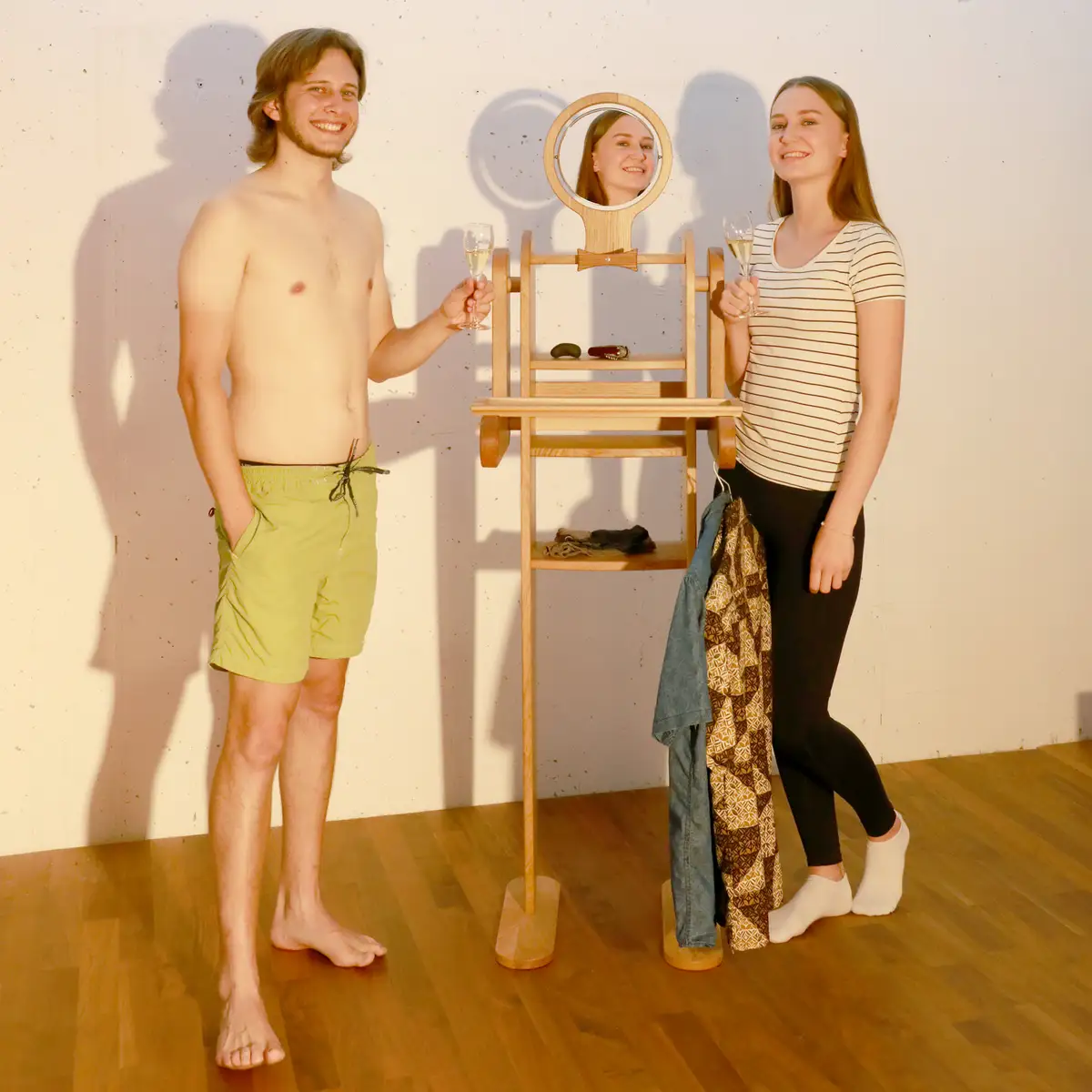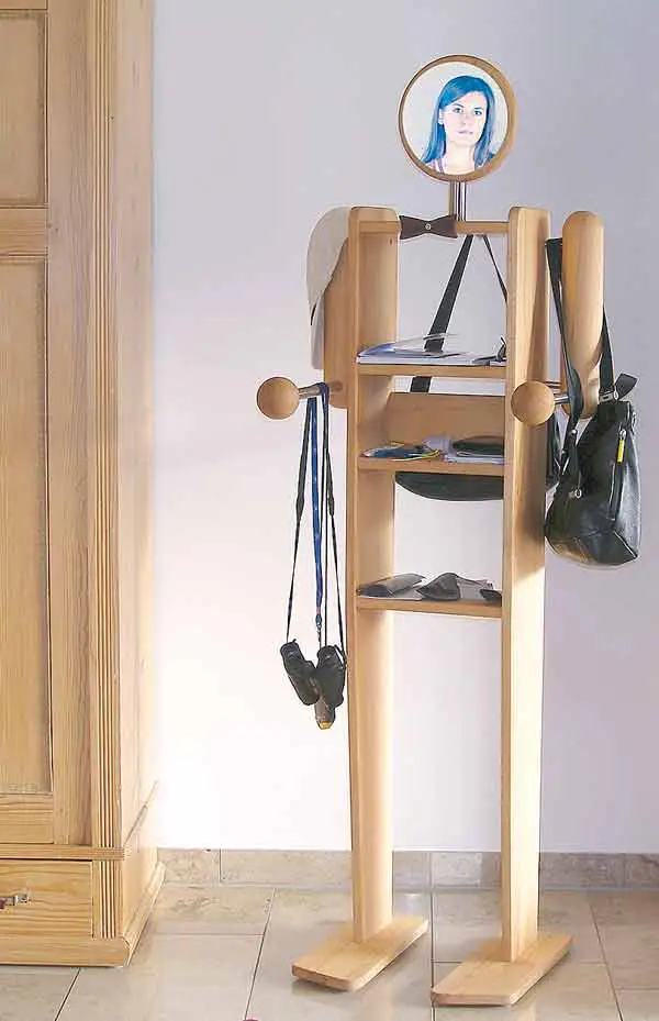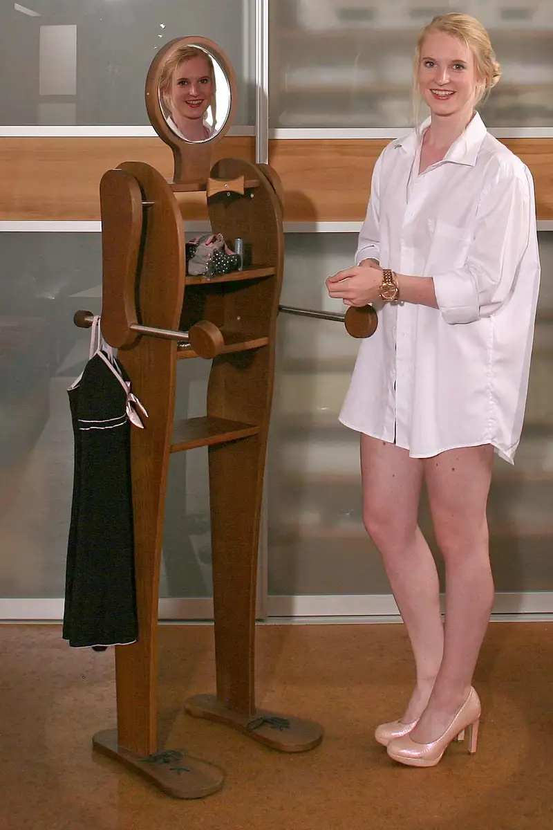 Giovanni steht jetzt eher in der Tradition der Pictogramme oder Strichmännchen, er ist zwar immernoch rund, aber nicht mehr so verspielt. Ansonsten hat sich nicht viel geändert, er kostet in Buche ab 890.- Euro plus Zubehör wie Tablett, Schuhbändle oder Hängestange und kann auch verschickt werden. Aktuell präsentiert von unserer Nachbarin Emma (re) und unserem Schreiner Peter (li).